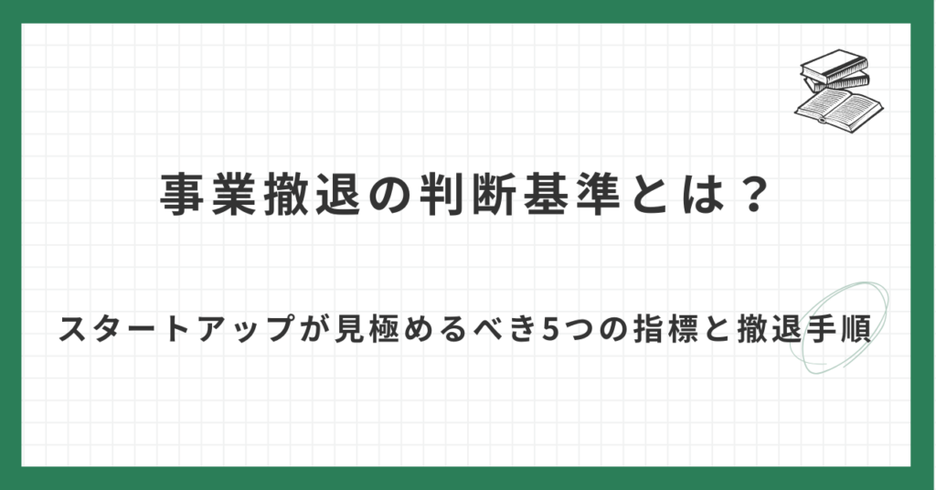 この記事でわかること 事業撤退の判断基準とは スタートアップが撤退を検討すべき5つのシグナル 撤退判断に使える5つの評価指標 撤退判断を誤らないための3つの視点 事業撤退の実行手順 スタートアップにとって新規事業への挑戦は成長の鍵ですが、すべての... -