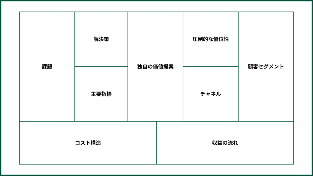 配置については、紙の左側に「製品・サービス」に関する要素(課題、解決策、主要指標)を、右側に「市場」に関する要素(顧客セグメント、チャネル、圧倒的な優位性)を配置します。中央には独自の価値提案を置き、下部に収益の流れとコスト構造を記載します。