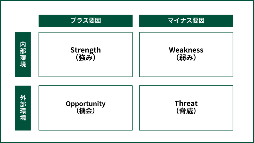 SWOT分析とは、自社の内部環境と外部環境を4つの視点で整理し、効果的な経営戦略を立案するためのフレームワークです。SWOTは、Strength(強み)、Weakness(弱み)、Opportunity(機会)、Threat(脅威)の頭文字を取った言葉で、これらを体系的に分析することで現状を客観的に把握できます。
